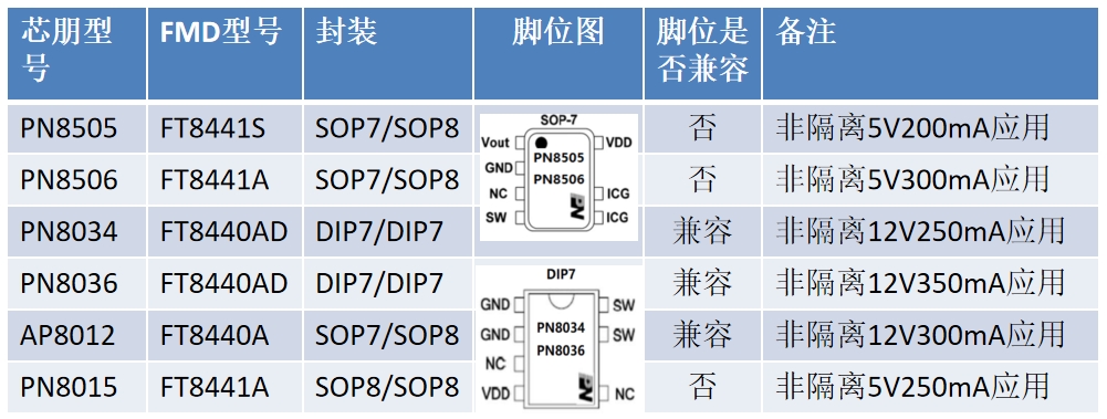 芯朋微的PN8034和PN8036型號(hào)與FT8440AD在封裝和腳位上完全兼容。PN8034是非隔離12V250mA應(yīng)用,而PN8036是非隔離12V350mA應(yīng)用,F(xiàn)T8440AD能夠無縫替代這兩款型號(hào),無需對(duì)電路進(jìn)行任何修改,即可實(shí)現(xiàn)相同的功能和性能。