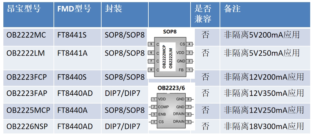 昂寶的OB2223FCP和OB2223FAP型號(hào)與FT8440S和FT8440AD在功能和性能上具有相似性。雖然在封裝和腳位上不完全兼容,但通過簡(jiǎn)單的電路調(diào)整,F(xiàn)T8440系列芯片可以替代這兩款型號(hào),為用戶提供更加高效和可靠的電源解決方案。