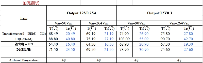 溫升測(cè)試結(jié)果顯示,兩款芯片在滿載運(yùn)行時(shí),關(guān)鍵部件的溫度上升均在安全范圍內(nèi)。例如,變壓器線圈(EE16)的溫升在73℃至75.5℃之間,遠(yuǎn)低于其最高工作溫度,確保了產(chǎn)品的長(zhǎng)期可靠性。