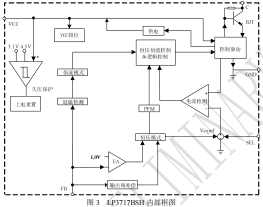 LP3717BSH 通過外置電阻,可調原邊峰值電流,再通過變壓器原副邊匝比來設置輸出恒流點;通過設定 FB 上偏電阻和下偏電阻來設置輸出恒壓點。為了實現系統成本的極致簡化,LP3717BSH 內置啟動電路,外圍不需要啟動電阻;采用自供電的方式來取消輔助繞組 VCC 供電二極管。