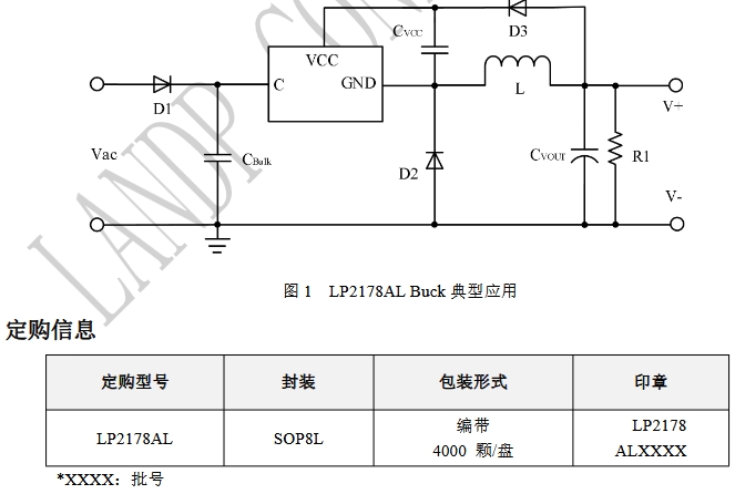 LP2178AL是一款高效率、高精度的非隔離降壓開關電源恒壓控制驅動芯片,其內部集成高壓功率管,采用恒壓控制模式,系統可工作于CCM和DCM模式。采用特有的PFM控制方式,改善音頻特性。外圍應用簡單,可靠性強。典型應用圖如下所示