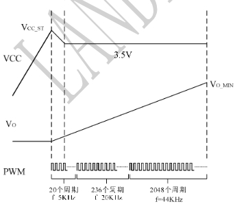 通過啟動電路給VCC電容充電,VCC達到啟動電壓VCC_ST,芯片輸出PWM開關信號。此時輸出電壓開始上升,因輸出電壓還小,VCC電壓會下降到3.5V,VCC通過自供電維持在3.5V。PWM開關信號經過以下3個階段,軟啟動結束。軟啟動結束時,輸出電壓上升到VO_MIN:若VO_MIN>3.5V,芯片正常工作;若VO_MIN<3.5V,芯片輸出短路保護。