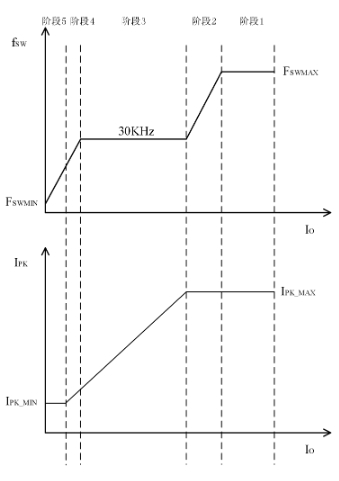 • 階段2:工作在最大峰值電流IPK_MAX,且工作頻率隨帶載電流減小從最大工作頻率FSWMAX減小到30KHz。