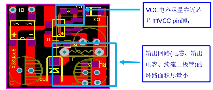 以BP2522D為例,持續(xù)輸出240mA,脈沖350mA,電感量為470uH,電感電流紋波為57mA。最大峰值電流為579mA,BP2522D內(nèi)部MOS管限制最大電流為750mA,留有一定余量,可取Rcs=0.3ohm。