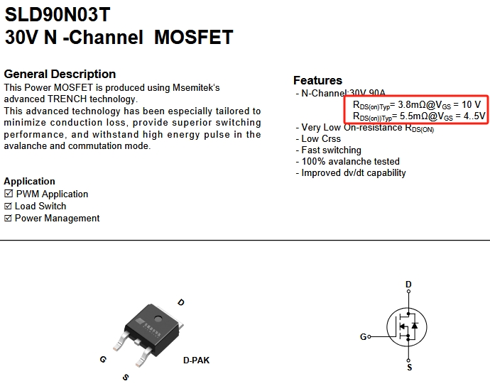 SLD90N03T:基于先進溝槽技術(shù)(Trench),優(yōu)化了柵極電荷(Qg)和開關(guān)速度,適合高頻PWM應(yīng)用。