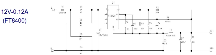 FT8410是一款輸出電壓為5V、輸出電流為0.15A的AC-DC恒壓芯片。其典型電路如下圖所示:
