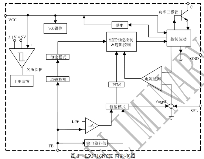 其中,SEL管腳的功能尤為關(guān)鍵,它通過(guò)與GND或VCC的不同連接方式,決定了芯片的內(nèi)置峰值電流閾值。當(dāng)SEL接GND時(shí),內(nèi)置峰值電流閾值為620mA;而當(dāng)SEL接VCC時(shí),內(nèi)置峰值電流閾值則為760mA。這種靈活的電流閾值設(shè)置方式,使得LP3716NCK能夠適應(yīng)不同功率需求的應(yīng)用場(chǎng)景。