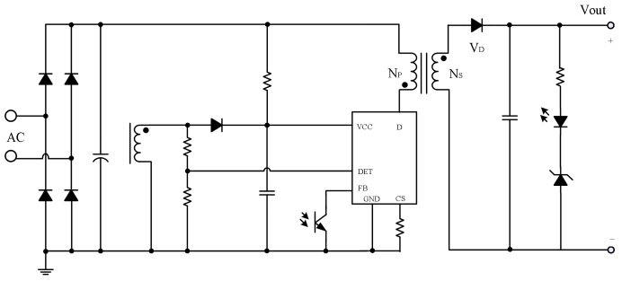 采樣鏈:DET 腳“一箭三雕”——退磁檢測、母線欠壓、輸出過壓;CS 腳做峰值電流;FB 腳收光耦。