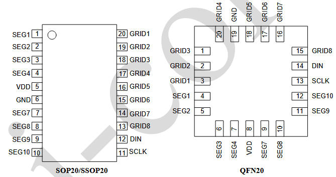 | 1-4,7-10 | SEG1-10 | O | 恒流段輸出,30 mA×256級PWM |