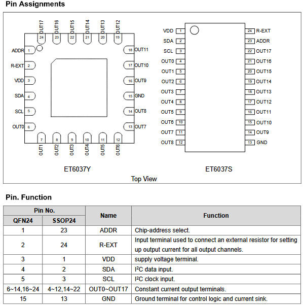 ET6037S 把「18 路恒流源 + 128 級 PWM + I2C 四地址 + RGB 分組」?jié)饪s進(jìn) 4×4mm 的 QFN24 或 SSOP24: