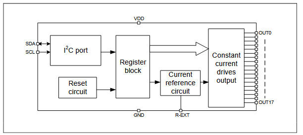 下圖展現(xiàn)了一顆「恒流源陣列 + I2C 控制器」的架構(gòu):