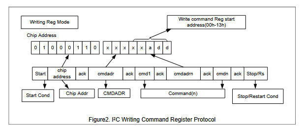 Start → ChipAddr(W) → ACK → RegAddr → ACK → Data0 → ACK … → Stop
