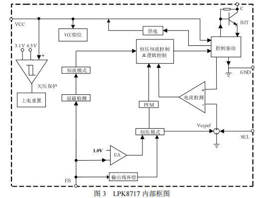 自供電技術(shù):VCC由芯片內(nèi)部專有電路供電,不需要輔助繞組的供電二極管,變壓器設(shè)計更簡單。