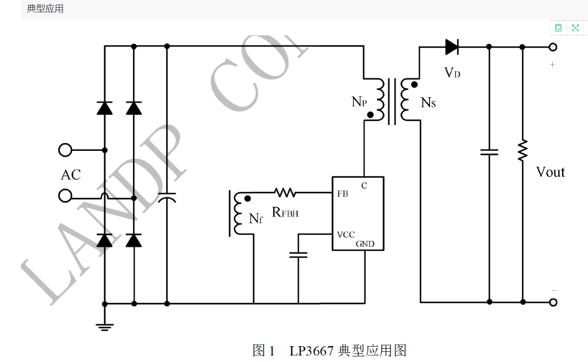 LP3667BH為了優化輸出電流的一致性, 內置輸入線電壓補償功能;為了節約外圍的線材,LP3667采用了固定輸出線纜補償的方式進行輸出電壓補償。LP3667BH集成了多種的保護功能,包括 VCC 鉗位/欠壓保護,輸出短路保護,過溫保護。