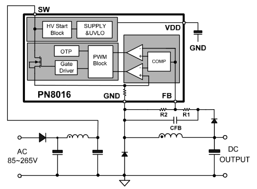 PN8016SSC-R1B集成PFM控制器及800V高雪崩能力智能功率MOSFET,用于外部元器件極精簡的小功率非隔離開關電源,輸出電壓可通過FB電阻調整。PN8016內置800V高壓啟動與自供電模塊,實現系統快速啟動、超低待機、自供電功能。該芯片提供了完整的智能化保護功能,包括過載保護,欠壓保護,過溫保護。另外PN8016的降頻調制技術有助于改善EMI特性。