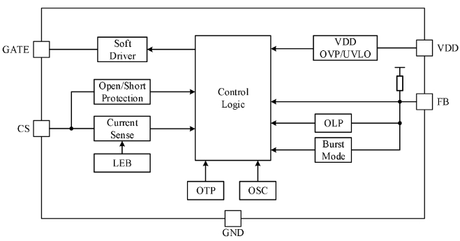 芯片通過對輸出采樣并反饋到光耦獲得高精度的恒壓輸出。內置的斜率補償電路確保了峰值電流模控制的穩定性。內部集成的頻率抖動功能可以改善EMC,降低EMI濾波成本。