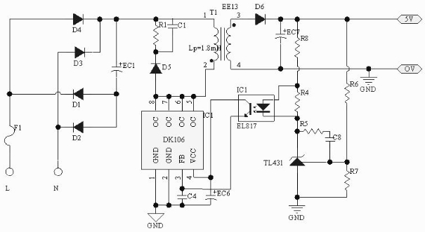 DK106芯片是專用小功率開關電源控制芯片,廣泛用于電源適配器、LED電源、電磁爐、 空調、DVD等小家