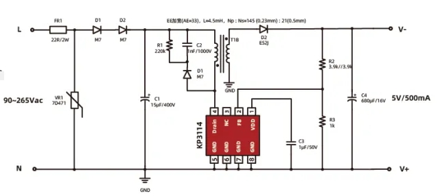 2. KP3114 -- 2.5W BUCK非隔離反激方案 5V/500mA