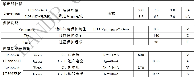 輸出線補償:LP3667BH具有6%的固定比例線纜補償,而LP3667B則為2%。這一差異可能會影響到輸出電壓的精確度和穩定性,尤其是在長距離傳輸中。